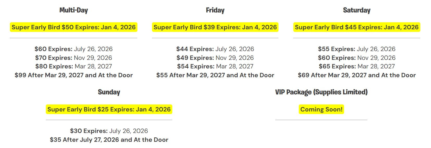 Instead of hunting for discounts, we’ve built them right into the registration system. As we get closer to the event (or as allotments sell out), badge prices will increase in set tiers. The earlier you register, the more you’ll save, but once a tier sells out or expires, the next price level will automatically take effect. Check the chart below for a full breakdown of badge types, pricing, and deadlines.